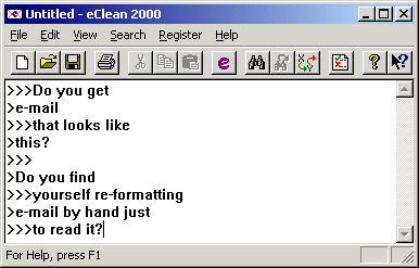 But eClean 2000 has one feature other text editors don't: it removes formatting marks from email messages leaving only legible text remaining. It automatically removes forwarding/reply marks ">" and unwanted line breaks in sentences and paragraphs.
