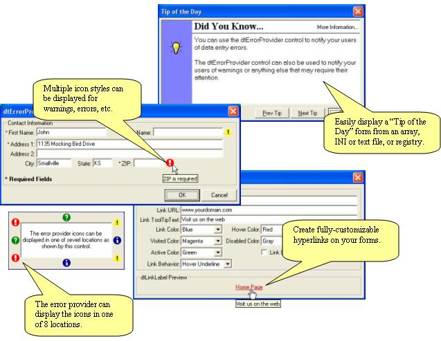 DtControls is a control library packaged as a single OCX control. Version 1.0 offers four useful controls (with more planned) in a single package. dtErrorProvider: provides an implementation of an error provider similar to .NET's ErrorProvider class. This control gives your application the ability to visually flag any controls that need attention. dtLinkLabel: provides a highly customizable hyperlink control similar to .NET's LinkLabel class. dtINILib: provides an INI access library that makes it simple to read and write INI files. dtTips: provides a "Tip of the Day" interface.